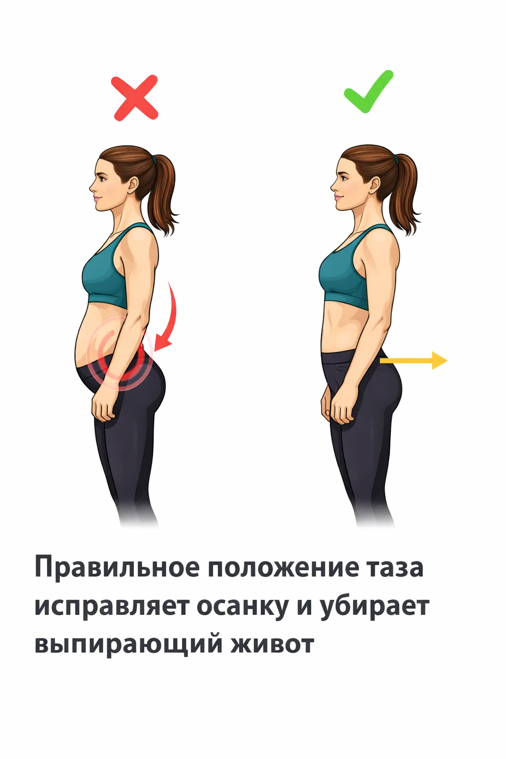 - Исправь передний наклон таза (подкрути таз вперед, напряги ягодицы)